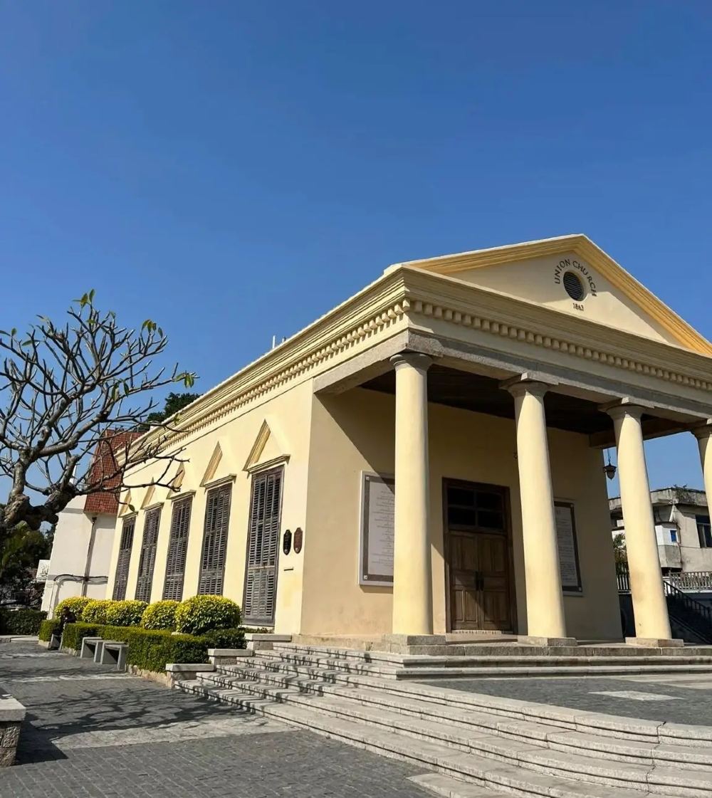 ▲ 协和创建于1863年,是鼓浪屿岛第一座专用的礼拜堂。林语堂先生与夫人廖翠凤就是在协和礼拜堂举行的婚礼,林语堂为了表达对廖翠凤白首不离的决心,在领取结婚证的当天,对廖翠凤说我们把结婚证烧掉吧,因为只有在离婚的时候才会用到结婚证,让廖翠凤大为感动,当天回家后,两人就将结婚证烧毁了。婚后两人的确恩爱一生,相伴到老、携手一生。他们的爱情故事,让现在的协和礼拜堂成了鼓浪屿的网红打卡点,婚纱摄影的热门地点,在蓝天白云下,淡黄色的教堂和洁白的婚纱显得十分唯美,在这里拍婚纱照真的很出片。