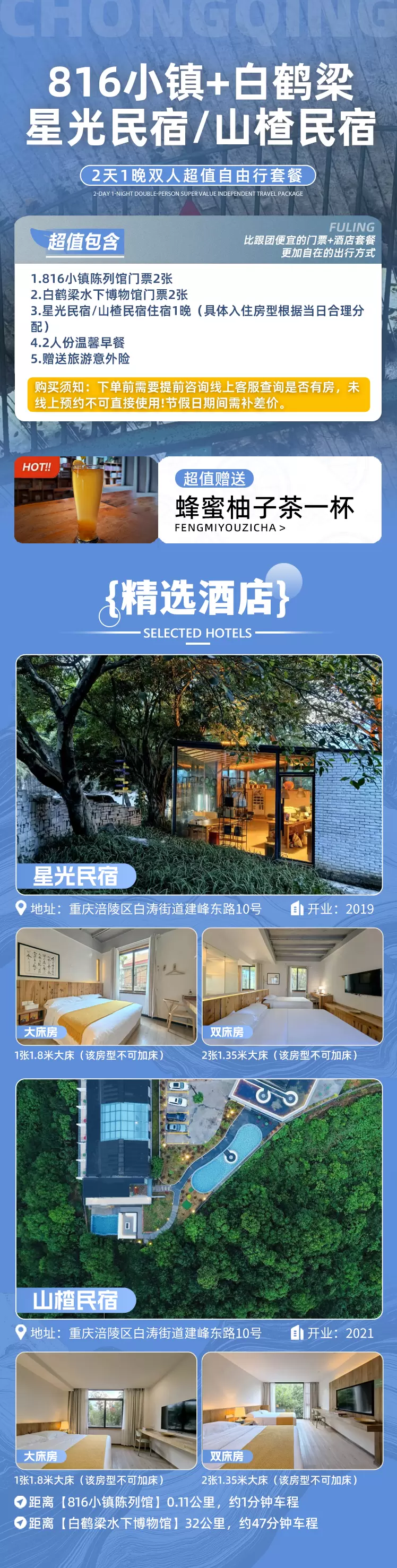 【酒店套餐】涪陵星光民宿/山楂民宿住宿1晚+双人816小镇+双人白鹤梁+双早
