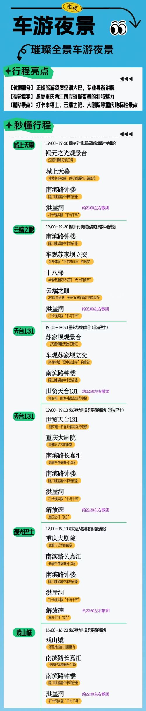 重庆璀璨全景车游夜景纯玩团-城上天幕云端之眼天台131戏山城【[优质服务]正规旅游资质空调大巴,专业导游讲解】