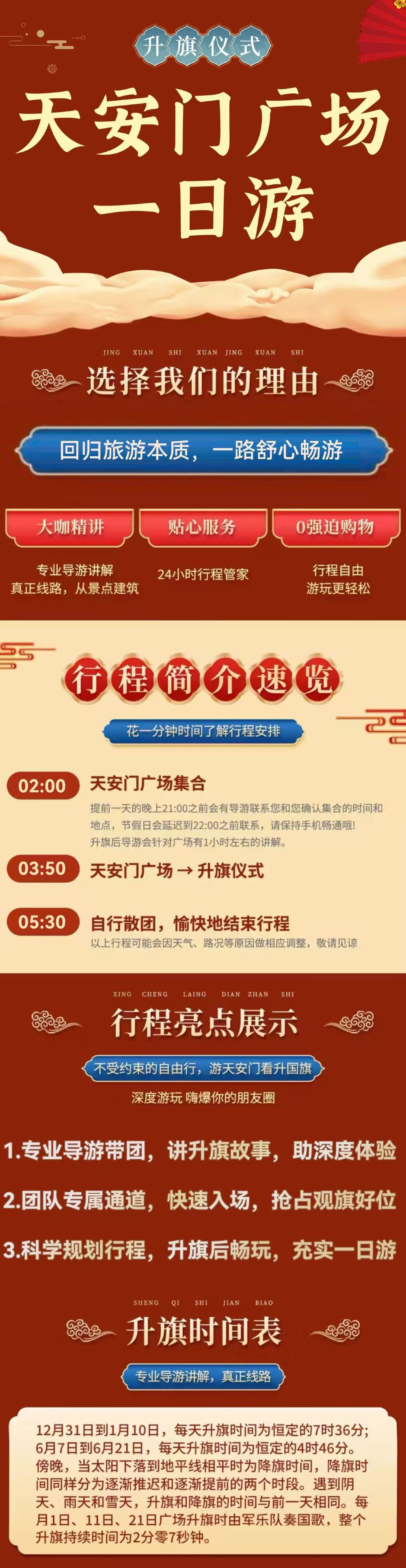 1,由于每天升旗时间不同,集合时间地点以导游通知为准!!!