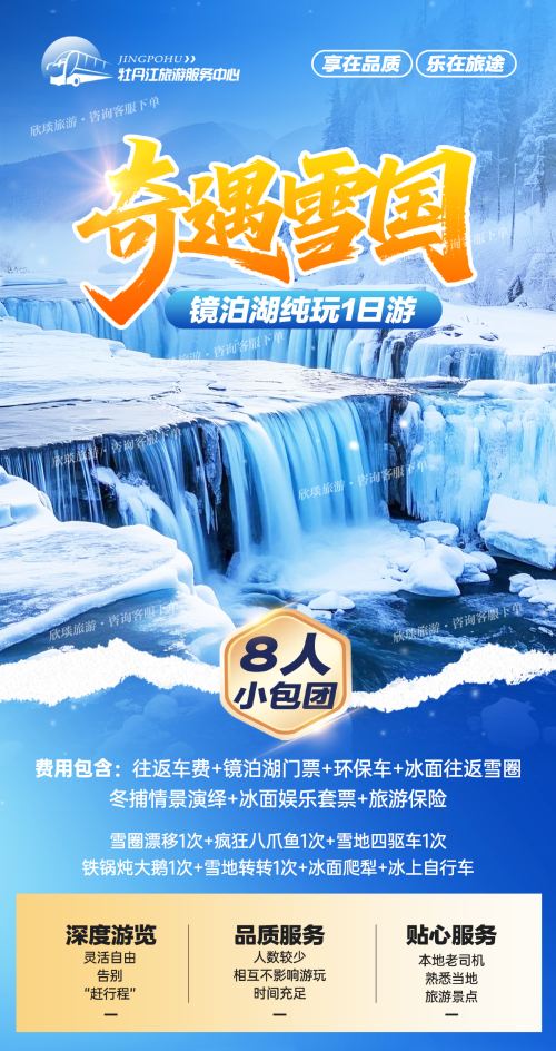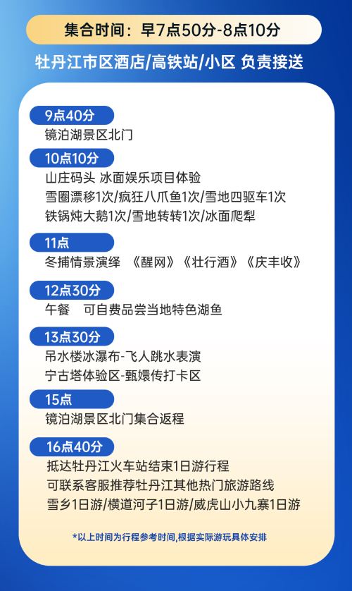 镜泊湖1日游【Mini 8人团接送+观冬捕+雪圈+冰面娱乐】【● [优选景点]镜泊湖冰瀑布┋复原宁古塔城区┋甄嬛传打卡区┋山庄码头┋观冬捕演绎┋玩冰面娱乐┋】