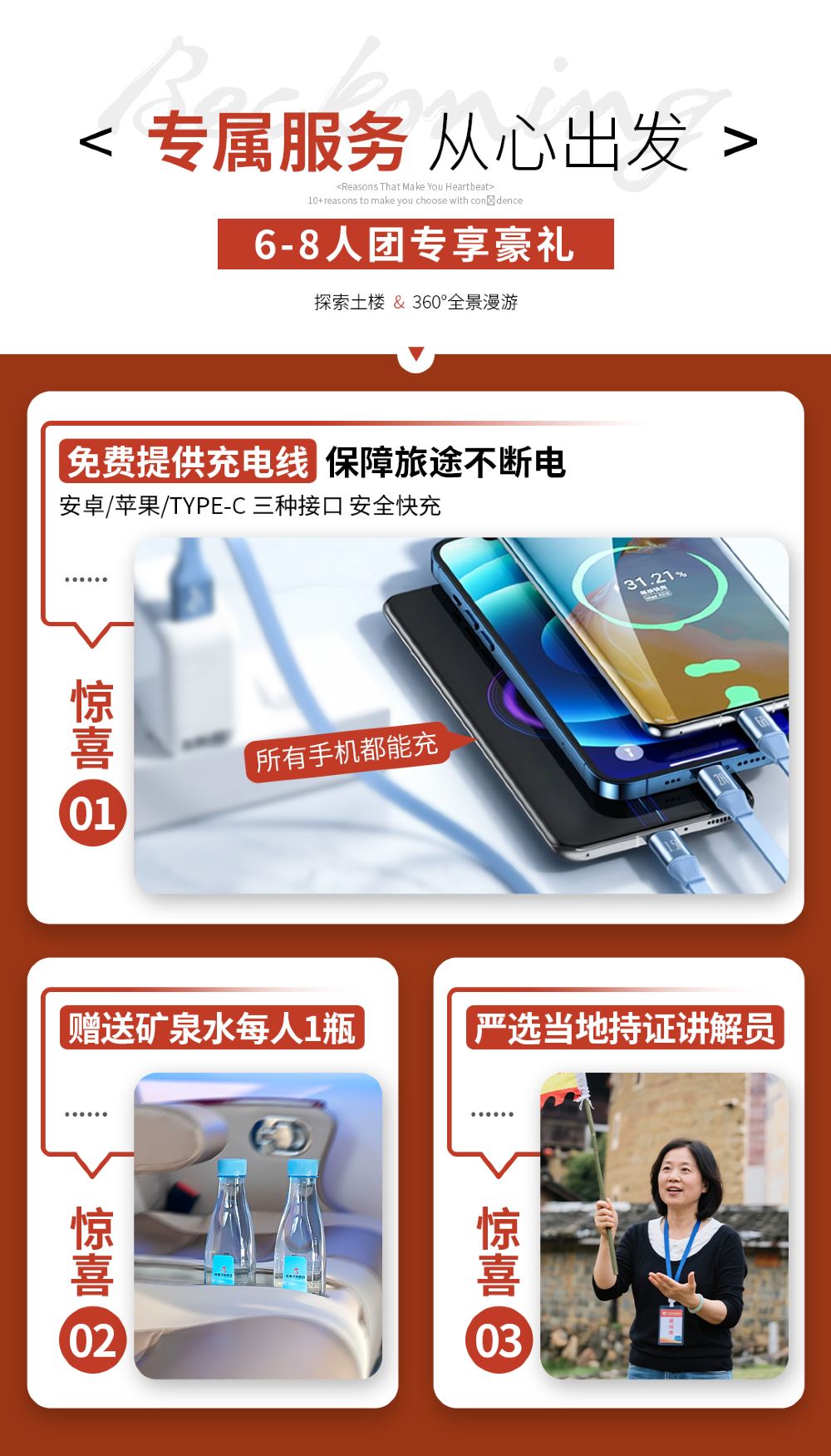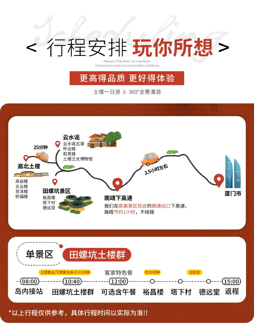 2、本产品按实际人数安排合适车型,并根据先到先上车原则,不预留位置,不接受指定座位,在不影响您行程的情况下,可能会南靖土楼和永定土楼共用车辆,交通过程中需要更换车辆,敬请谅解~