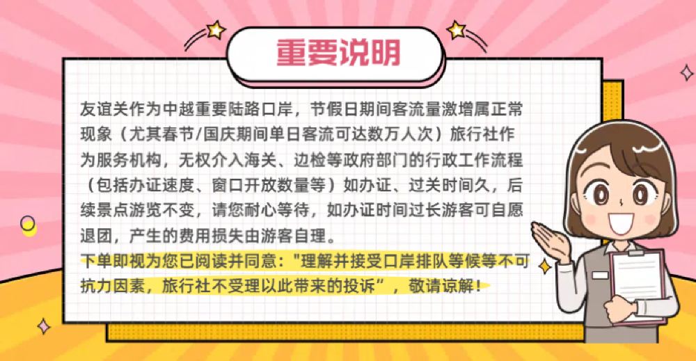 下单即视为您已阅读并同意:"理解并接受口岸排队等候等不可抗力因素,旅行社不受理以此带来的投诉”,敬请谅解!
