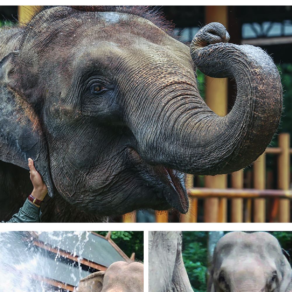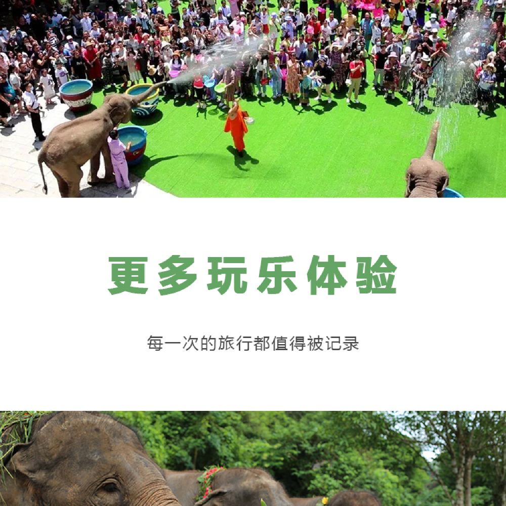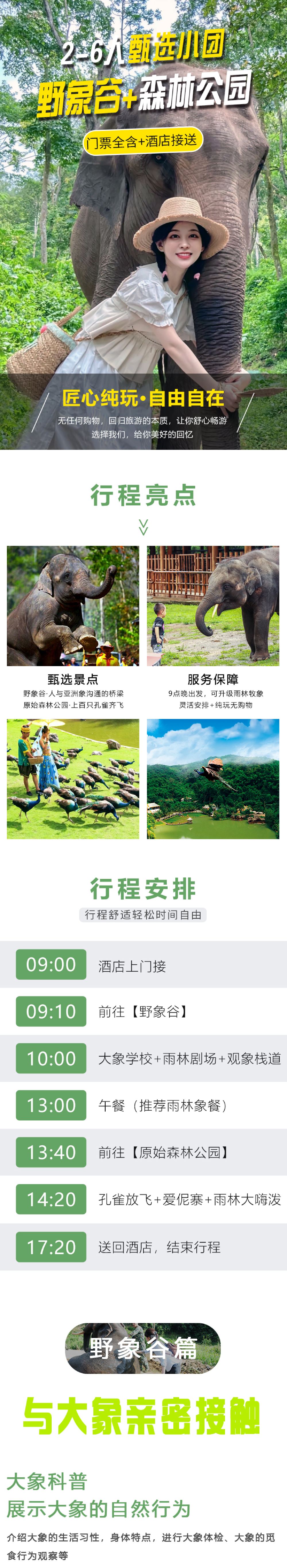 【雨林牧象】6-20人左右一组每场,行程在50分钟左右结束,先跟着象(1头象)走一段(400米左右),到喂象点排队喂象、拍照。之后人、象分开由导游带着走路出来(800米左右),途中可以看到小动物。(全程与大象接触时间20分钟左右 )