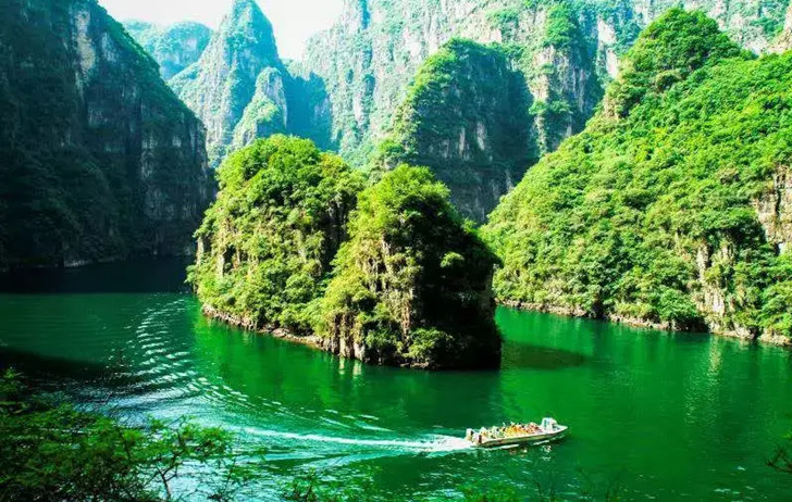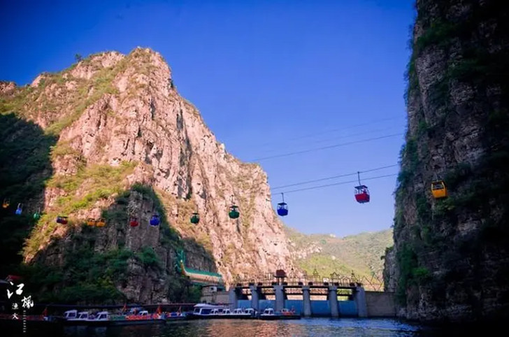 北京龙庆峡被人们誉为北京的小漓江。龙庆峡水库高耸的大坝相连着两座山,其宽有四五十米,大坝犹如一把白色的巨锁把龙锁住了。登上大坝俯瞰北面,墨绿色的水面倒影着山峦和白云。东西的两座山,峭壁直立,像刀切似的,足有几十丈高,“龙庆峡”可能由此峡而得名。当你划船而渡,大有“山重水复疑无路”、“柳暗花明又一村”之感。水似飘罗带,曲曲弯弯,山不转水转,仿佛永无尽头,每转一山就是一景。那千姿百态的山和石,有的像出鞘的剑,有的像举起的大锤,有的像昂首的虎,有的像扭着头的象……因此人们根据它们的形状取名为“震山如来”、“鸡冠子山”、“金缸山”等等。