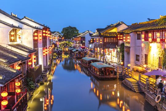 坐游船行于河道上,看绿柳拂水,河中舟船往来频繁,水乡的柔情被展现得淋漓尽致。若要在岸上感受水乡,那么登上山塘街的新民桥,便可将山塘河与两岸挂着红灯笼的老房子尽收眼底。山塘街上林立的美食店、工艺品店,也很能满足逛吃的需要。