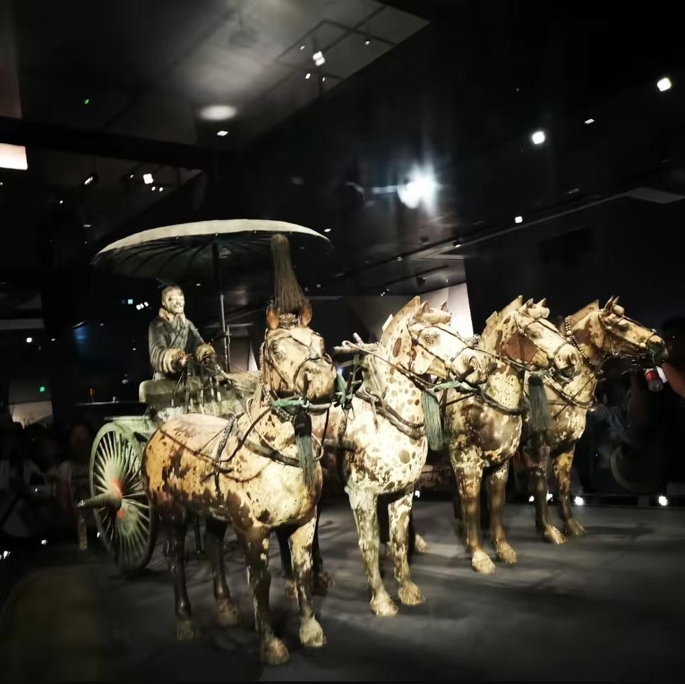 ▲ 青铜车马:古代科技聚焦 “青铜之冠” 的工艺 —— 讲解车马伞 “遮阳 + 避雨 + 防御” 三重功能,车轮青铜毂的润滑技术,以及金银错纹饰的象征意义,还原秦代 的智慧