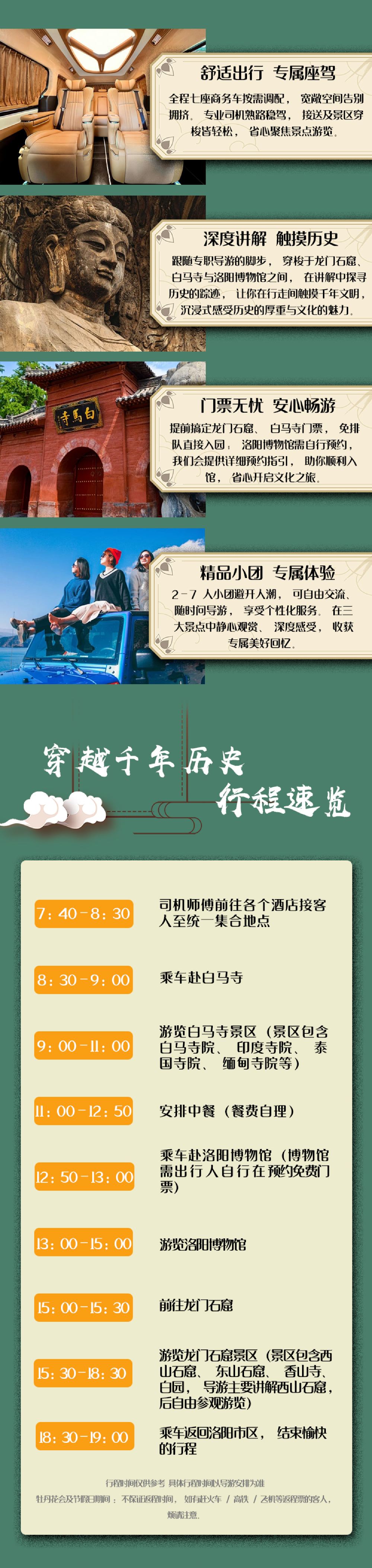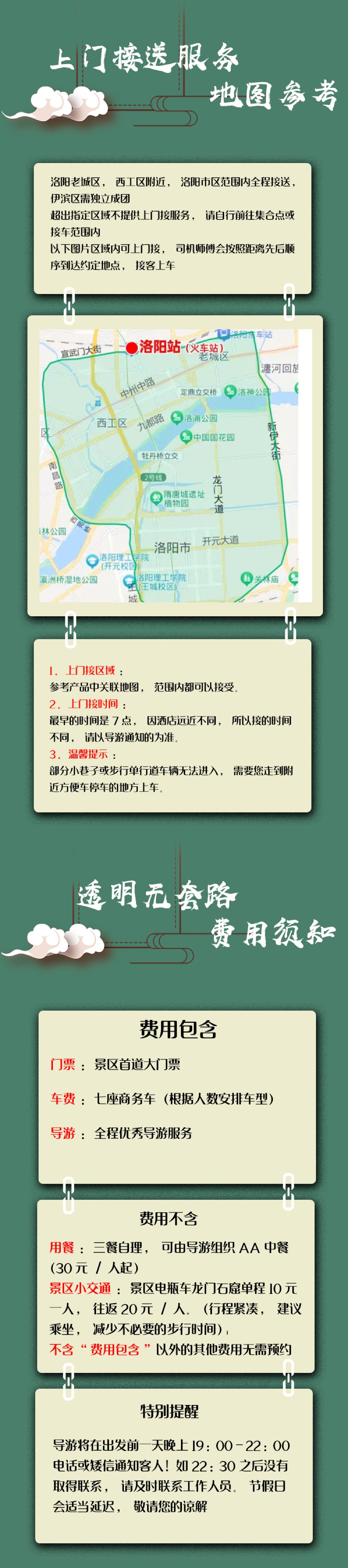 2.行程结束后专车送回酒店或洛阳市区任意位置,行程当天可免费送高铁站/火车站。