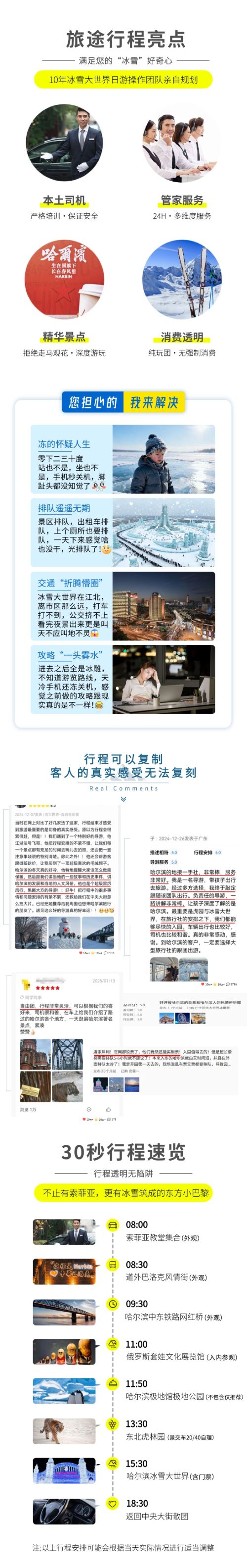 行程包含了哈尔滨的精华景点,东北虎林园,套娃展览馆,中华巴洛克风情街,冰雪大世界,您担心的攻略我们帮您安排,不绕路,节省时间,中餐我们为您提供具有中国特色的东北手工饺子;