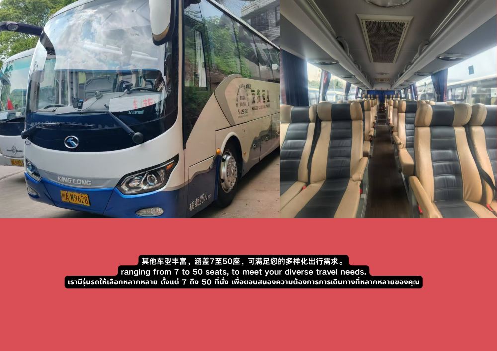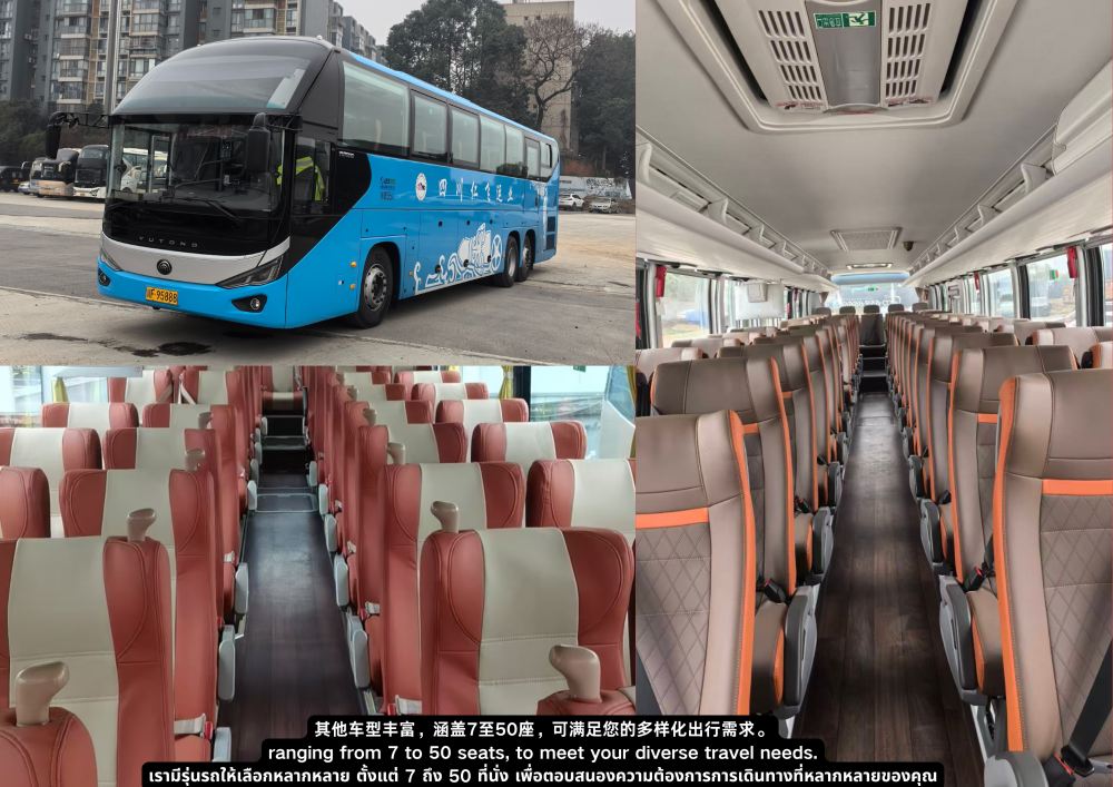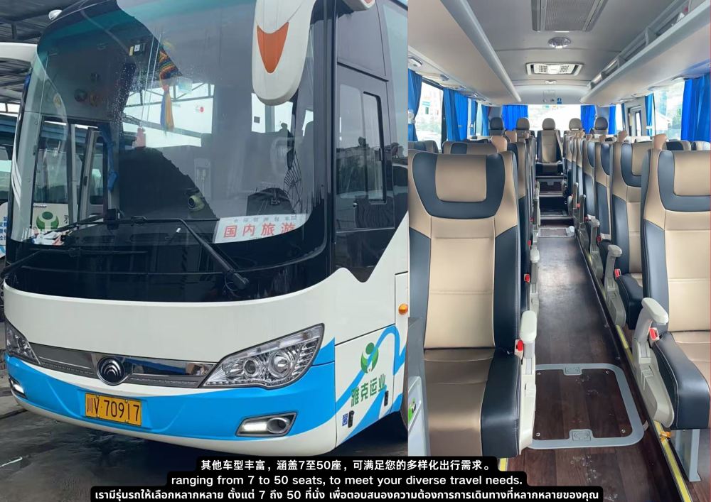 ▲ 9座宇通豪华保姆车,宽适空间,配备中排航空座椅与USB充电口,旅途舒适便捷。 (可放置22-26寸行李箱10个)