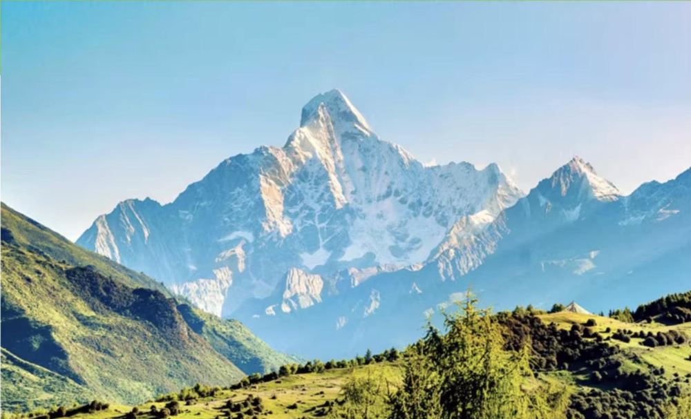 ▲ 主峰高耸入云,山顶覆盖着白雪,在阳光的照射下闪耀着光芒。山脚下是连绵起伏的翠绿山丘,与远处的雪山形成了鲜明的对比。