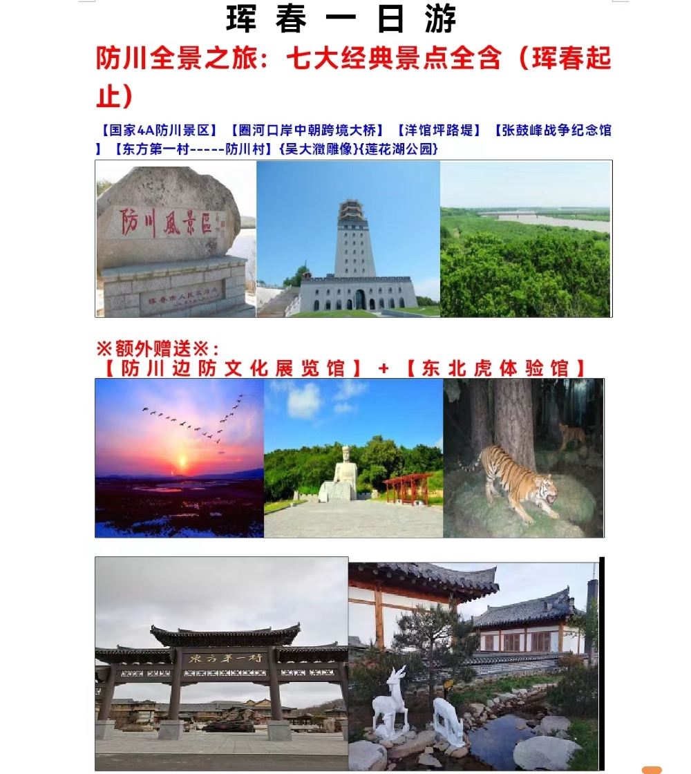 早上9点珲春集合出发,乘车前往防川(车程约68公里);乘车约30分钟到达【圈河口岸】参观,走上中朝跨境大桥,零距离看朝鲜,中朝最后一块119界碑合影拍照。中朝俄边境虽“鸡鸣犬吠惊三国”近在咫尺,但是三国民俗多种多样,可参观体验三国丰富的民俗风情。乘车约20分钟到达 【洋馆坪路堤】(停留拍照约10分钟),午餐后抵达【防川风景区】参观(时间约2小时左右),防川位于吉林省东南部,珲春市敬信镇。总面积139平方公里,是我国中、俄、朝三国鼎足地带。东南与俄罗斯哈桑镇包得哥尔那亚小镇接壤,西南与朝鲜的 豆满江市隔江相望。前方距离15公里就是日本海。登【龙虎阁顶楼】(费用包含)“眼看三疆山川风貌,耳听三国鸡鸣狗吠”。参观【龙虎阁四楼】【东北虎体验馆】(赠送),参观【龙虎阁二楼】【防川边防文化历史展览馆】(赠送),感受祖国曾经的那段悲怆的历史;进一步了解东北发展历史,参观后大家在【龙虎阁一楼】集合,准备出发。乘车10分钟抵达【张鼓峰战争纪念馆】(费用自理)感受中国历史,聆听精彩的讲解;参观东方第一村,防川村,深切体验保存完好,纯正朝鲜族民俗文化.最后参观民族英雄【吴大澂雕像】(停留拍照、休息约15分钟);参观后乘车返回珲春。