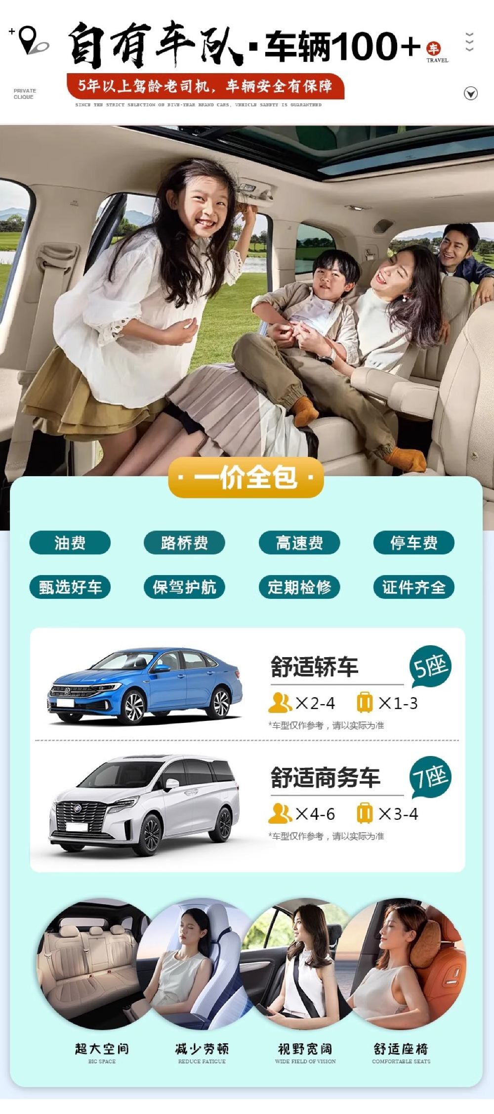 用车:默认车型安排为 5-7-9 座轿车/越野/别克/瑞风/福特。可以联系客服升级用车!