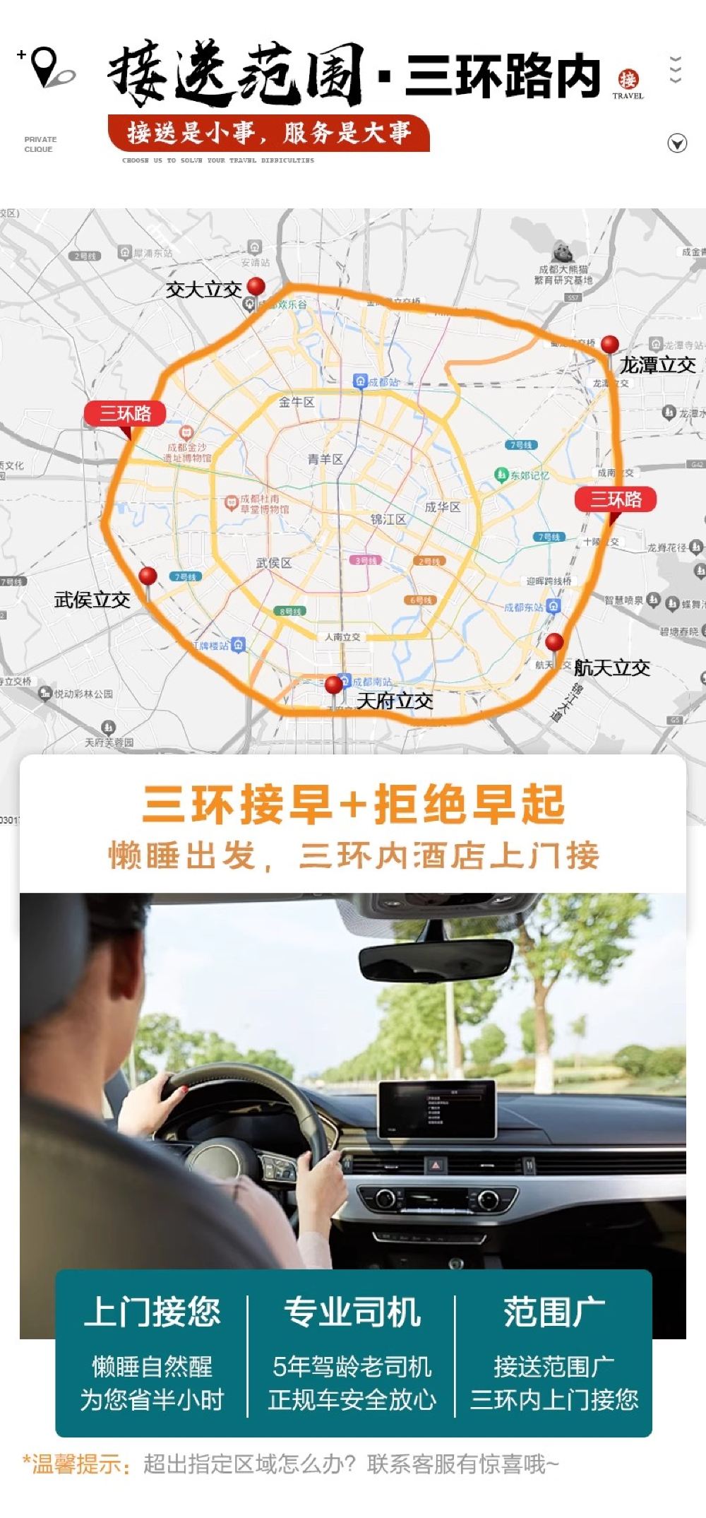 赠送:成都三环内任何地方或者酒店,享受专车一站式的接早和回送服务。
