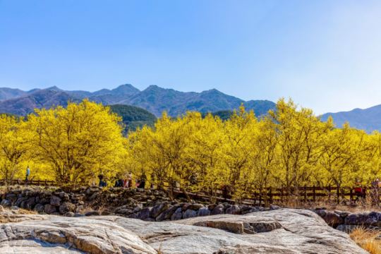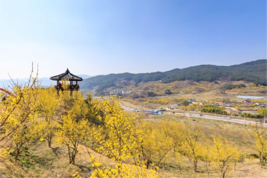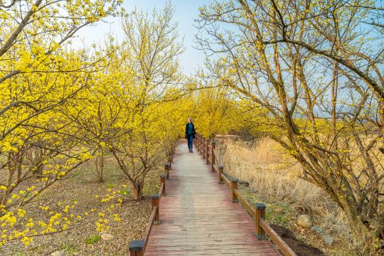 ▲ 每年三月春意初至,求礼山谷会被山茱萸的金黄花朵铺满,形成代表性的春季景观。