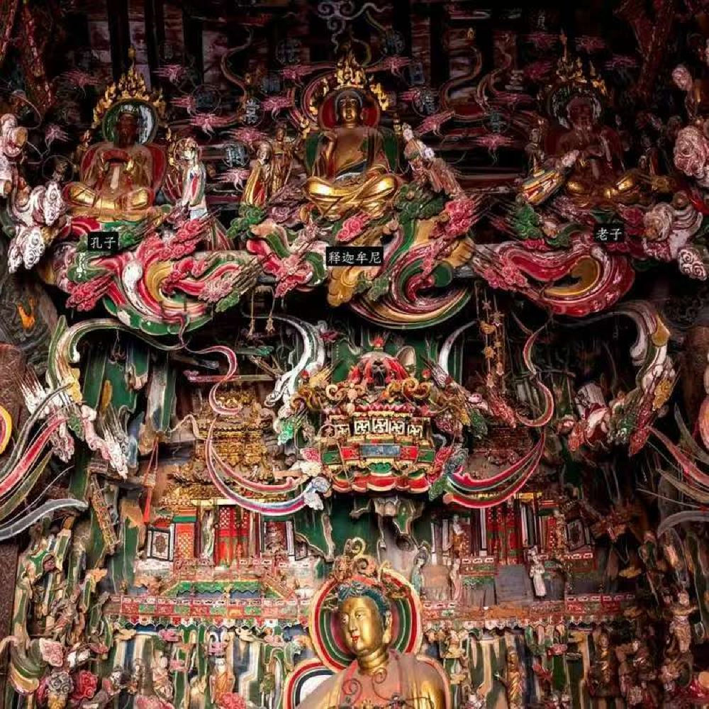 三教合一:明间观音菩萨上部并排塑有儒、释、道三教祖师,中间为佛祖释迦牟尼,右侧为儒家鼻祖孔子,左侧为道教先祖老子 。