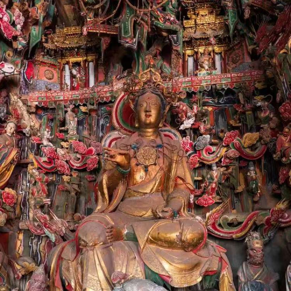 彩塑与悬塑:正殿内佛坛依后壁和两山墙布列彩塑、悬塑500余尊。佛坛平面呈凹字形,坛上明次间依后壁设置佛龛,内奉观音、文殊、普贤三大士像,殿内四壁及佛龛隔墙上布满悬塑,题材为儒、释、道三种神祗人物 。