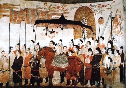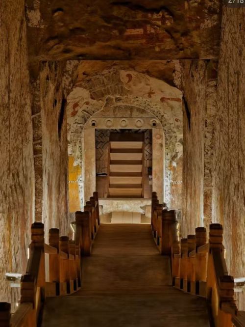 ▲ 隔着玻璃能看到一条长达20多米的墓道,墓道两侧有着略微浅显的绘画印记,再往深处看,正中央就是墓门,是国内保存完好的的北朝壁画,为研究当时的丧葬制度、社会生活、民族融合、壁画艺术等提供了重要资料。