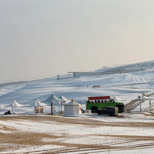 ▲ 白色的蒙古包和雪地、沙丘相映,还有绿色的车辆,是冬季沙漠旅游的特色住宿和活动场景。