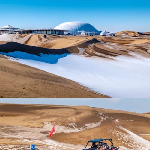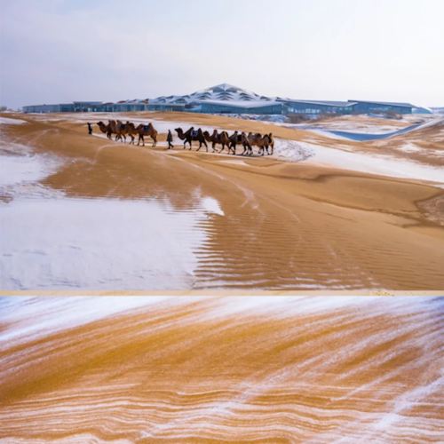 ▲ 冬季的库布齐呈现 “雪沙共生” 的独特地貌,蓝白相间的沙丘极具视觉冲击力;同时,沙漠越野项目也能在冰雪沙地上带来别样的刺激。