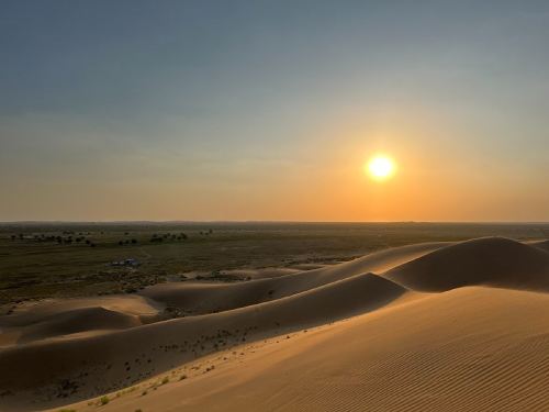 ▲ 连绵的沙丘在夕阳下呈现出温暖的金色,光影勾勒出沙脊的优美线条,是库布齐标志性的自然景观之一。