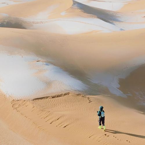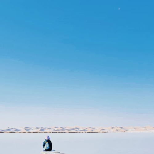 ▲ 沙漠中的湖泊在冬季结冰,形成一片洁白的冰面,有人在冰面上行走,展现出沙漠与冰雪交融的独特景象。