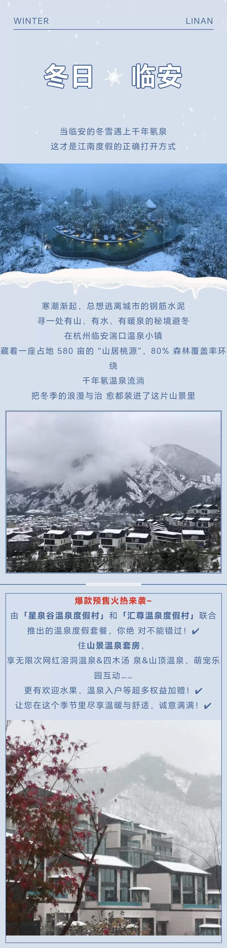 【房间含私汤】杭州临安湍口温泉度假村1晚+早餐+可选自助晚餐/大明山万松岭滑雪场+山景温泉+近湍口众安氡温泉