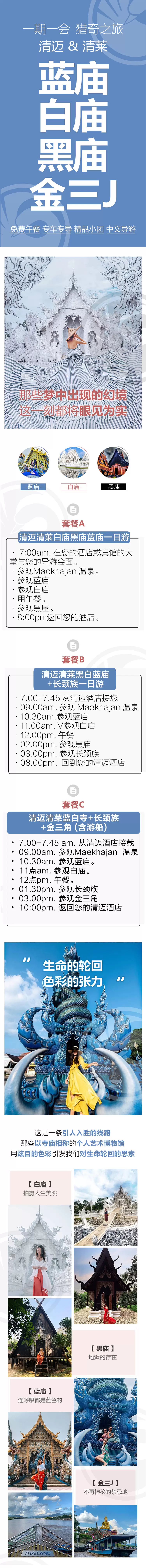 清迈白庙+黑庙+蓝庙一日游【(中文导游一车一导)温泉可选搭配金X角长颈族】