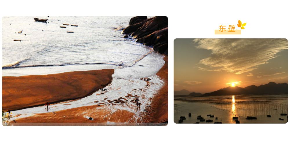 东壁依山临海,视野开阔,是拍日落的理想景点。沙滩上,一条弯弯曲曲的水道,小溪流从中穿过,冲刷岀一片复杂多变的纹理,柔美的线条在日落的余辉下呈现出金灿灿的色调,给多彩的沙滩增添几多生机。东壁的摄影点不仅能拍到气势恢宏的日落,也能拍到渔民捕鱼织网的场景,更有疑是银河落九天的优美线条。