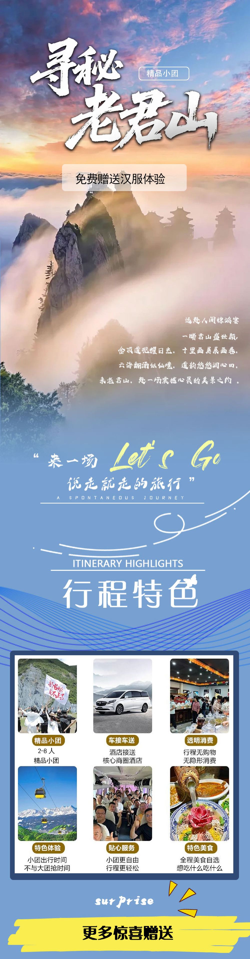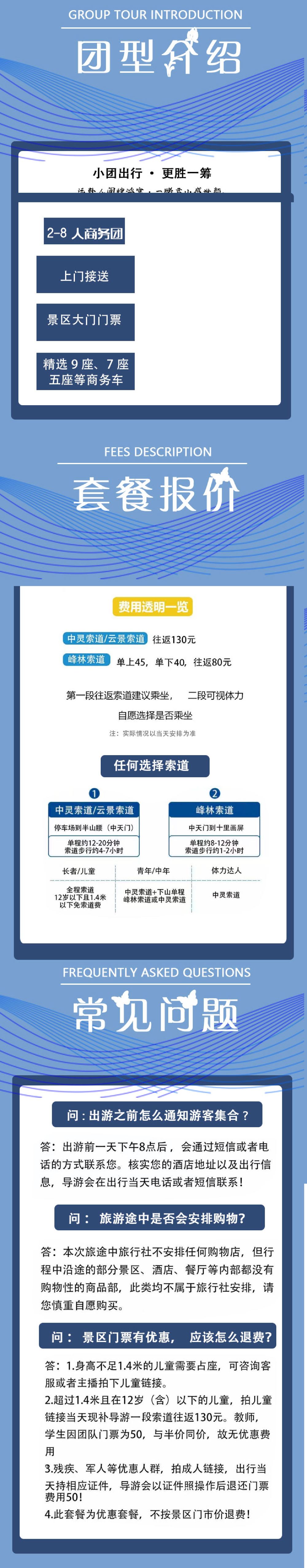 1.商务8人团成人套餐包含:往返车费+门票+第一段索道往返+【登山杖·祈福牌·矿泉水】