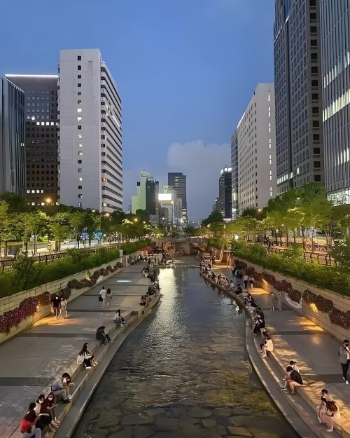 14:00 至清溪川,沿河畔散步,打卡水幕景观与现代建筑,拍城市治愈景致。