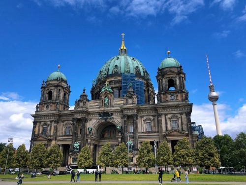 ▲ 柏林大教堂:建于1894年至1905年,采用文艺复兴和巴洛克复兴风格,是德国第一大新教教堂。教堂内部装饰华丽,有镶金马赛克圣画装饰的穹顶、汉白玉和缟玛瑙制成的祭坛等。其地下墓室安葬着94位霍亨索伦王朝王室成员。柏林的标志性建筑之一。