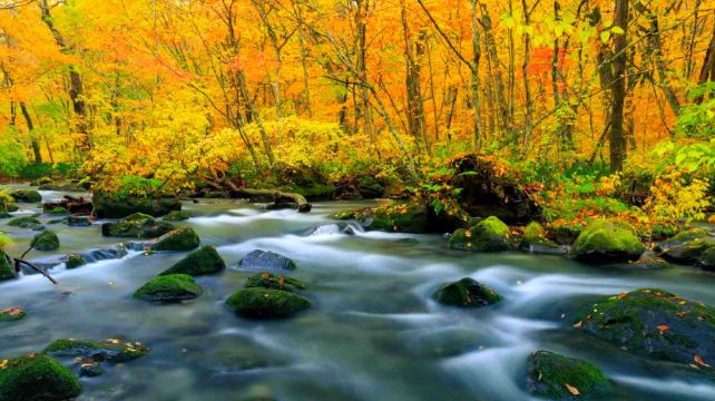 诗情画意的人间仙境奥入濑溪流,水流清澈,岩石长满苔藓,四周满是落叶阔叶林。盎然的绿意、披上了秋衣的森林、冰与雪的世界.. 这里的景致美不胜收。被官方认证为特别名胜及天然纪念物。
