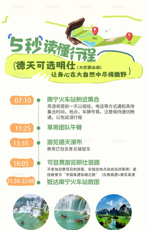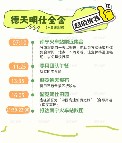 悦享旅途:天天发班,舒心出游,全程店,每人每天赠送一瓶矿泉水。