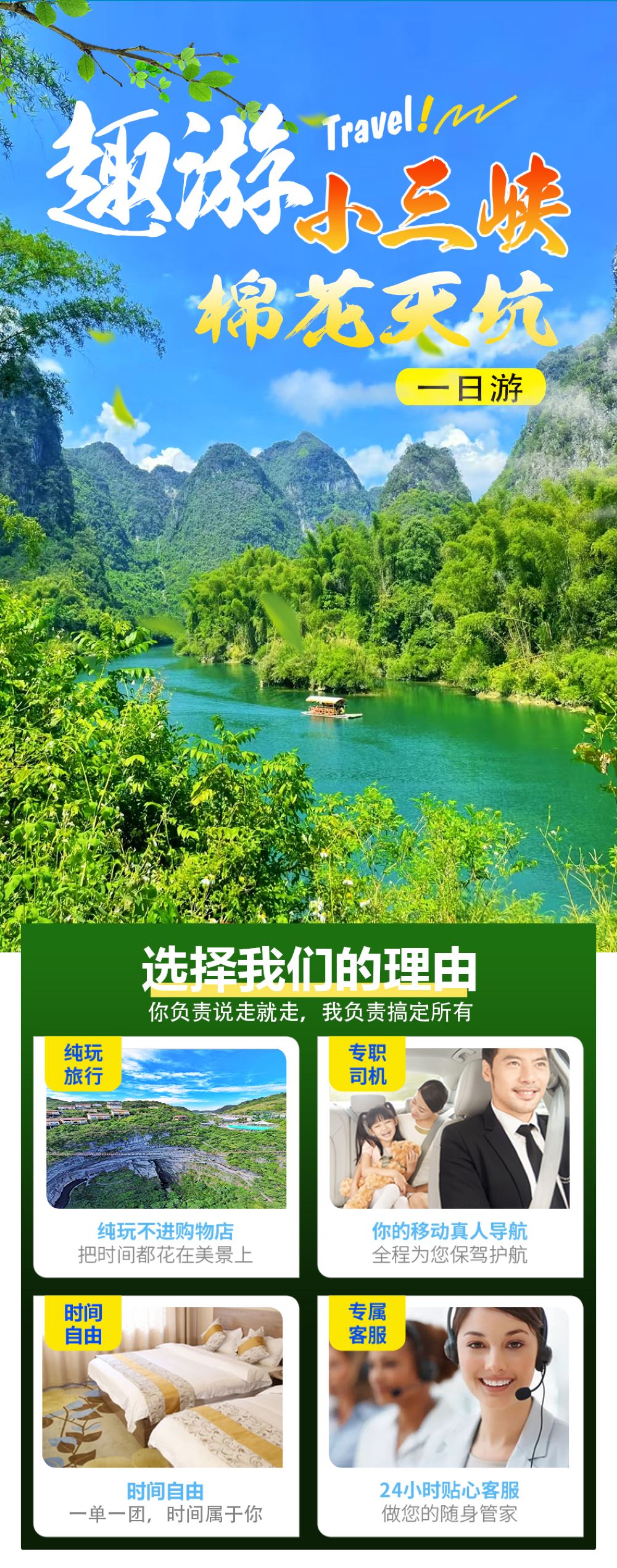 - 后前往游览【河池小三峡】景区由天门峡、神门峡、龙门峡等组成,两岸山峰兀立、绝壁斧削、钟乳倒县、古藤挂天、曲径通幽,水天一色,比长江三峡更险峻秀色,素有“南国水上大峡谷“美誉。以喀斯特地貌为主,山峰奇特,两岸山峰兀立,直插云霄,仿佛是大自然用巨斧劈开大地后留下的杰作,如天门峡的两座大山,给人以强烈的视觉冲击。山峰形状千奇百怪,有的像雄狮盼日,有的像蝙蝠展翅,还有的像将军峰,栩栩如生,让人不禁感叹大自然的鬼斧神工。峡谷幽深,峡谷两侧的绝壁如同被斧头削过一般,陡峭光滑,几乎与地面垂直,展现出大自然的磅礴力量,峡谷蜿蜒曲折,江水在峡谷中流淌,形成了许多曲径通幽的景观,让人在游览过程中不断有新的发现和惊喜。溶洞奇特,在峡谷的崖壁上,分布着许多溶洞,洞内钟乳石倒县,有的像瀑布,有的像动物有的像人物,形态各异,在灯光的映照下,如梦如幻。峡谷中的溶洞和崖壁上,还生长着许多古藤,这些古藤有的粗如手臂,有的细如发丝,它们相互缠绕,从崖顶垂挂下来,形成了独特的景观。江水清澈,龙江水在峡谷中流淌,江水清澈见底,宛如一条碧绿的丝带,与两岸的青山、蓝天相互映衬,水天一色,美不胜收。