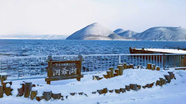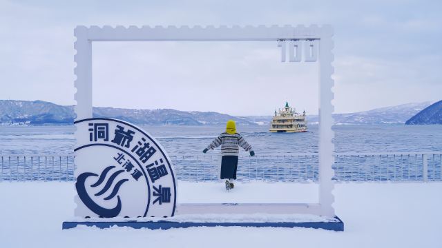 ▲ 洞爷湖展望台(可体验雪地摩托-需自费) 冬日里,湖面倒映着周围皑皑雪山,与岸边的积雪相映成趣。 (如不参加雪地摩托体验,您可以在雪地摩托园区内自由玩雪,打雪仗,拍照。不会提供其他备选景点。)