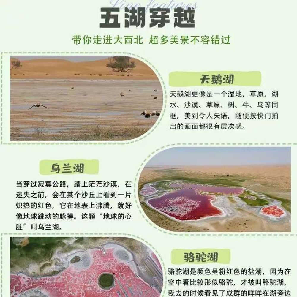 【包车游五湖穿越免费升级六湖4人小团】一日游赠航拍+无限滑沙【【免费升级六湖穿越】乌兰湖、天鹅湖、骆驼湖、 海溜淇湖、吉他湖、龙眼翡翠湖(五湖没有龙眼 翡翠)】