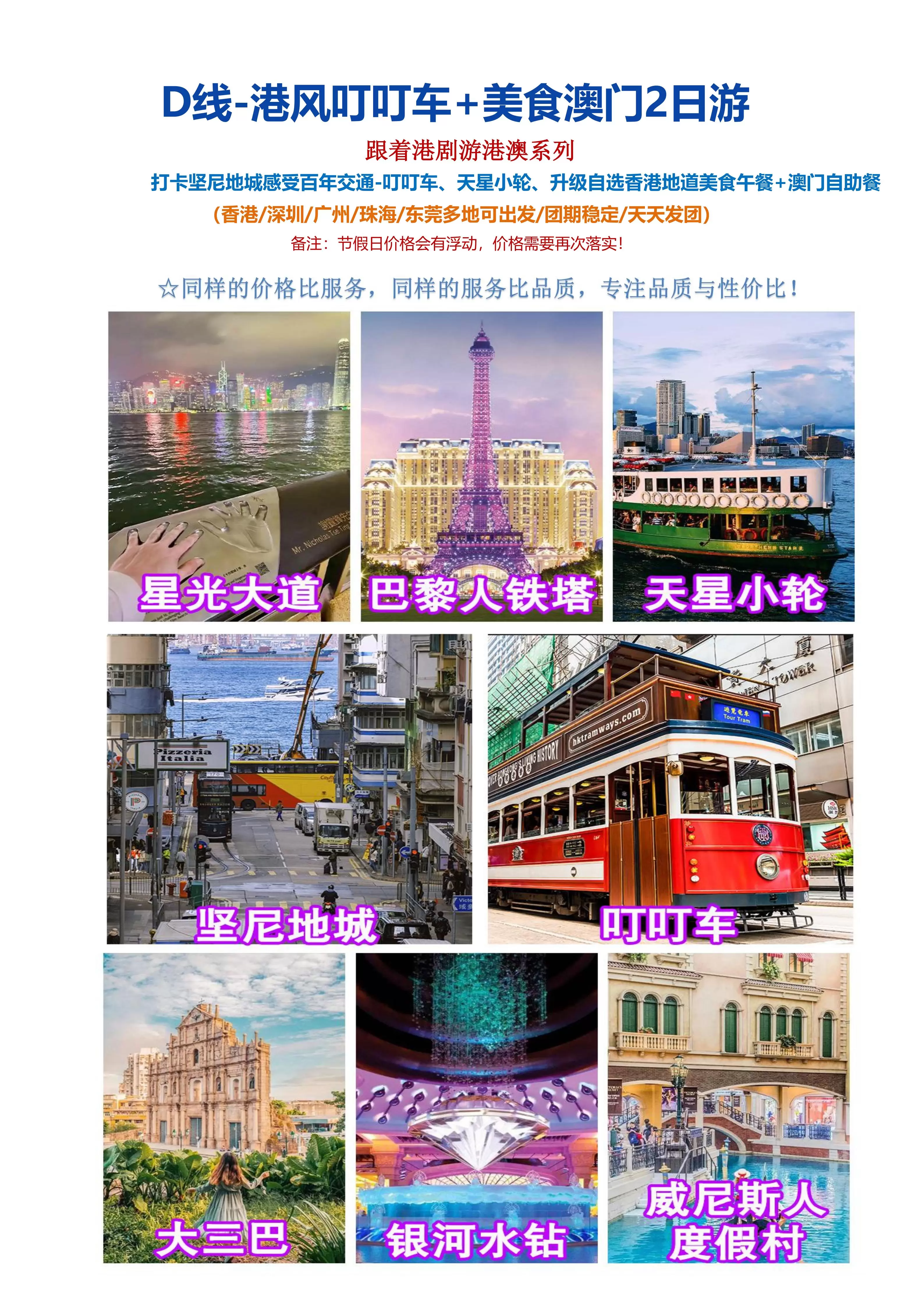 香港+澳门纯玩2日丨港风叮叮车+美食澳门【送上网卡+保险+2正餐丨车观港珠澳大桥,住香港酒店丨香港出发】