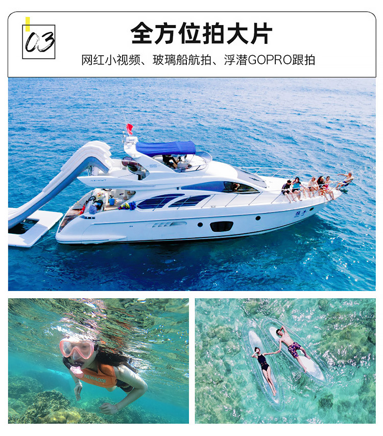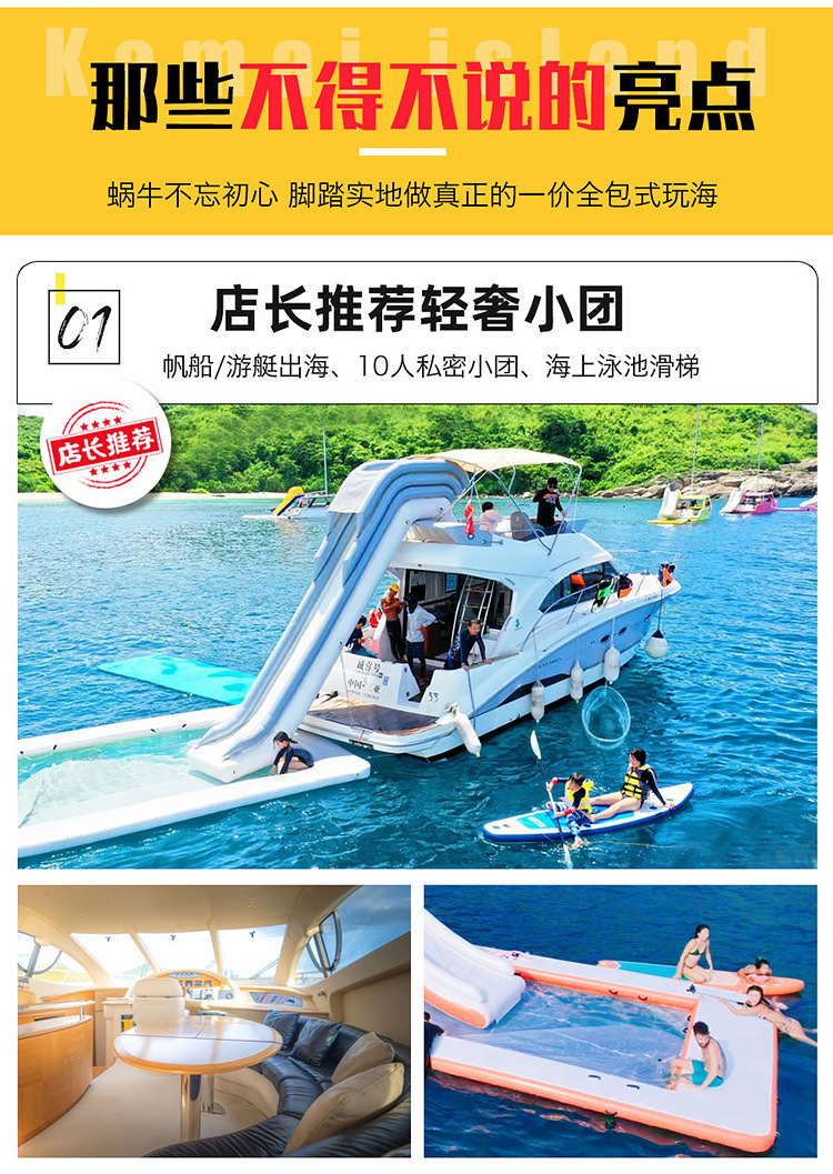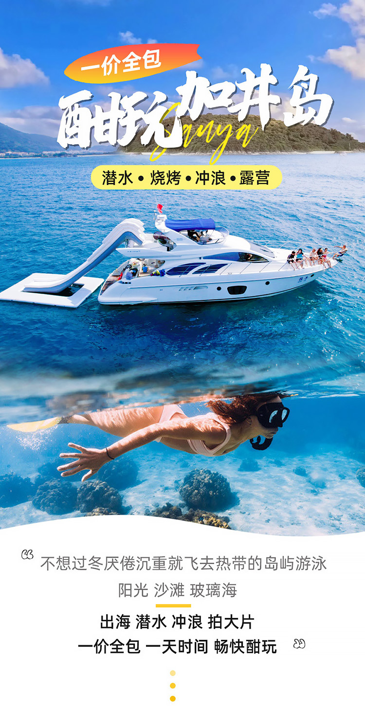 万宁石梅湾加井岛一日游【浮潜+玻璃船+香蕉船+摩托艇+午餐可选6-10人团帆船游艇出海赠泳池滑梯】