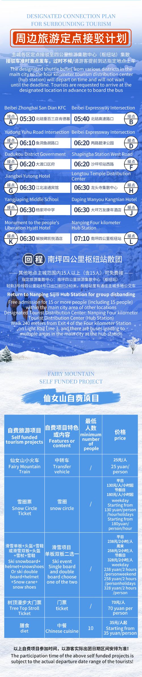 5、仙女山滑雪场内的滑雪项目为客人自愿参加消费,您可根据自身情况选择。如不参加滑雪项目,可以在滑雪场附近玩雪、赏雪。