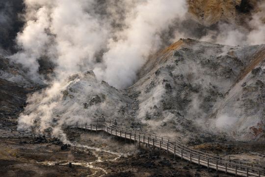 ▲ 登别地狱谷 火山之力在这里毫不掩饰地展现。白色蒸汽从岩缝间升腾,硫磺气息弥漫山谷,荒凉而震撼的地貌仿佛置身异世界。沿着木栈道深入地狱谷,近距离感受大地呼吸的节奏,是登别代表性的自然奇观之一,也是初到北海道不可错过的震撼景点。