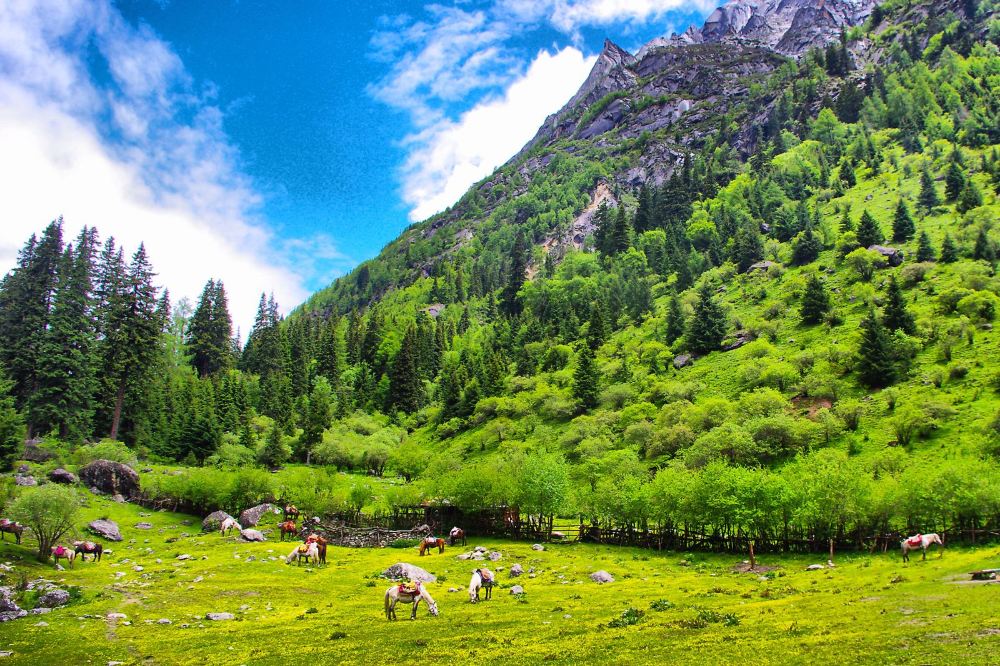 ▲ 四姑娘山双桥沟景区得名缘于沟内的两座木桥。沟内主要以雪峰、牧场、草地、森林等为主,是四姑娘山景区美丽的一条沟。漫步沟内,可体验到真正的牧区风光。主要景点有阴阳谷、四姑娘山景区-猎人峰、日月宝镜和五色山等。当地老百姓为了通行方便,在沟内搭建了两座木桥,其中一座是由杨柳木搭建而成,俗称杨柳桥;另一座由红杉木搭建而成,俗称便桥。四姑娘山双桥沟景区由此得名。四姑娘山双桥沟景区内山势陡峭曲折,林木葱郁。既有低山地带常见的成片桦木林、柏杨林,也有高山带的云杉、冷杉、红杉更有成片的沙棘、灌木、落叶松。