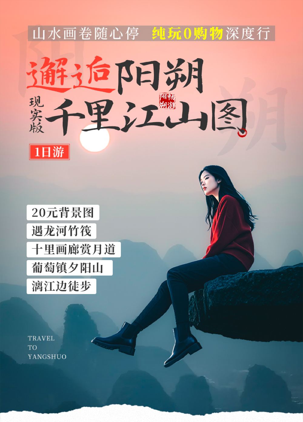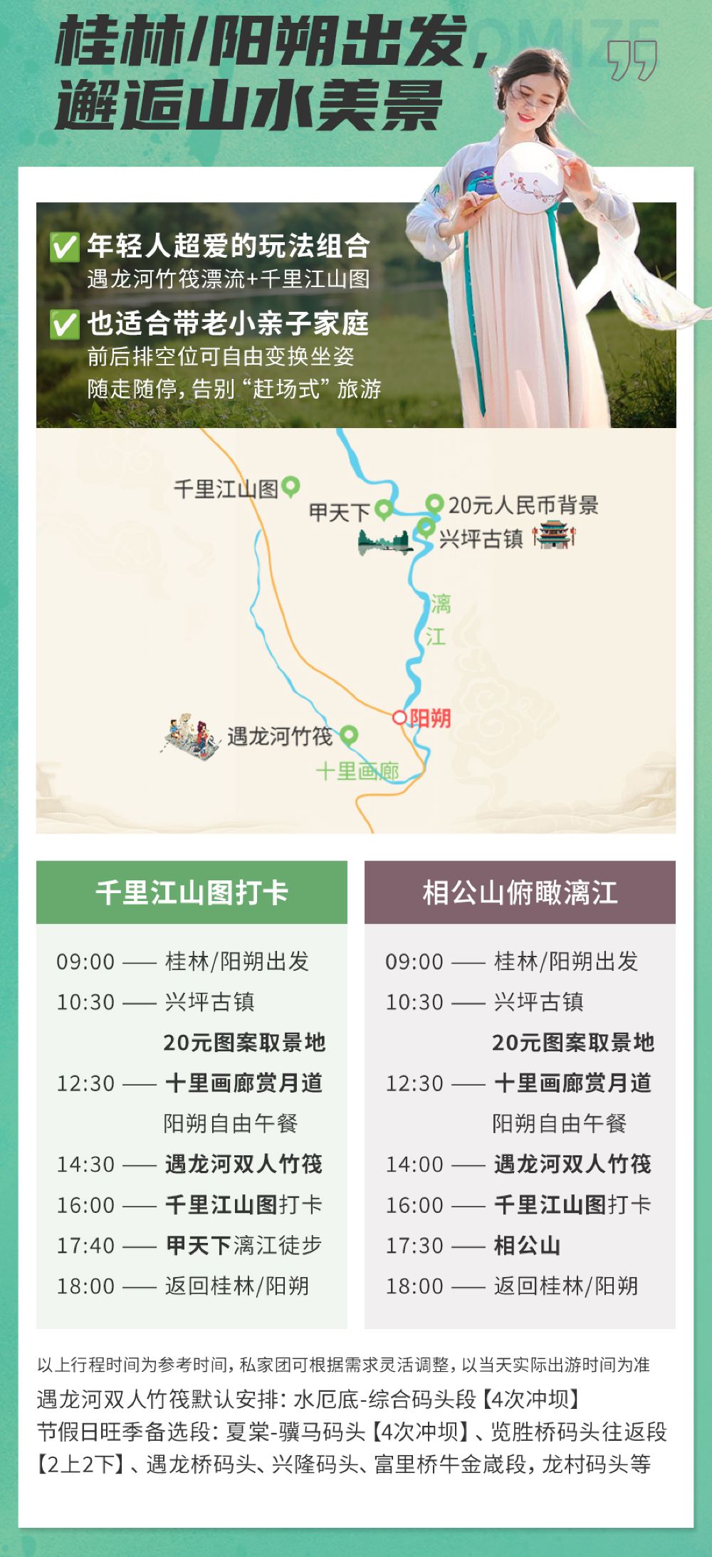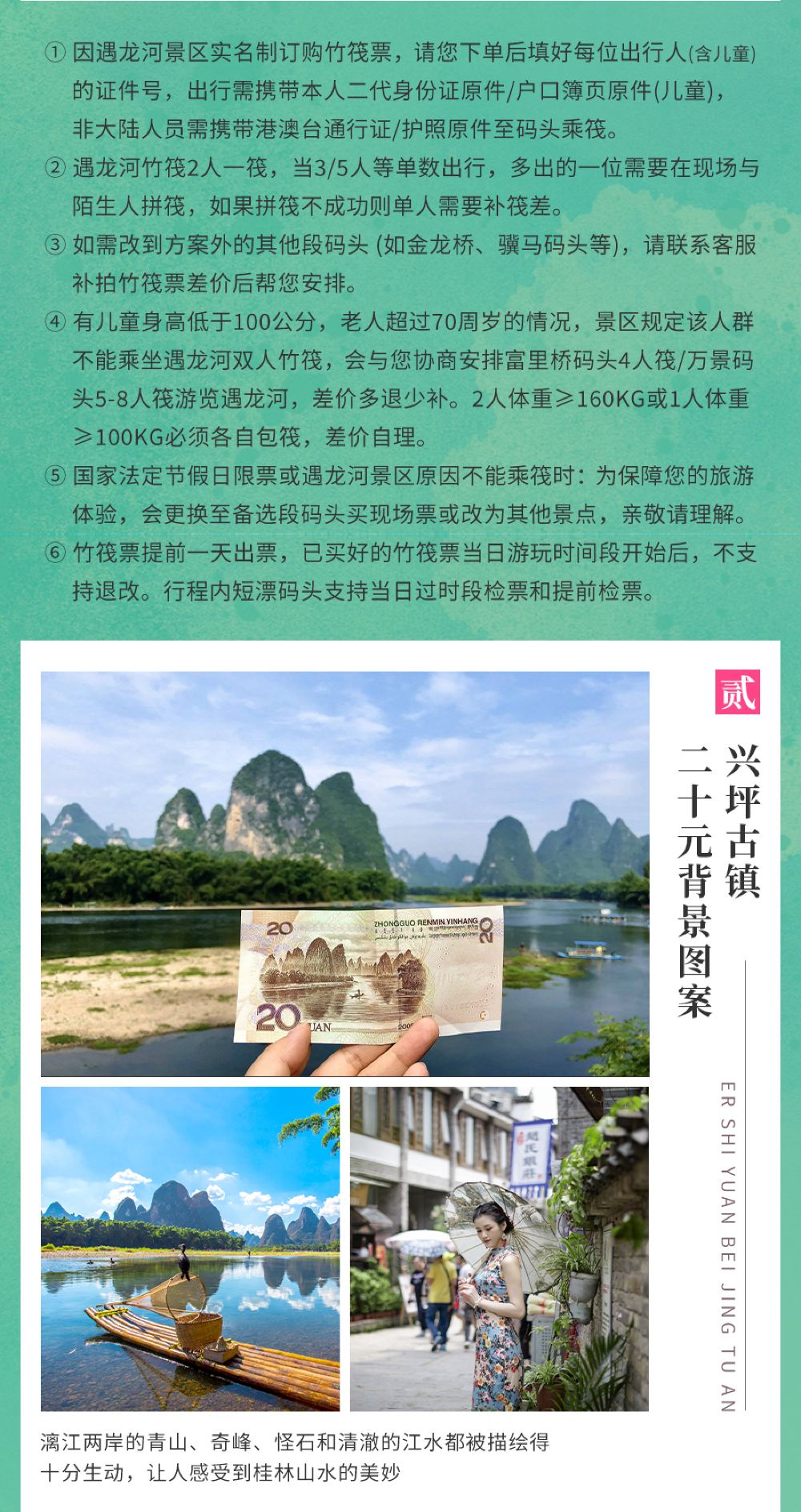 此行程为【兴坪古镇+漓江20元背景打卡+遇龙河竹筏+千里江山图+甲天下漓江徒步】