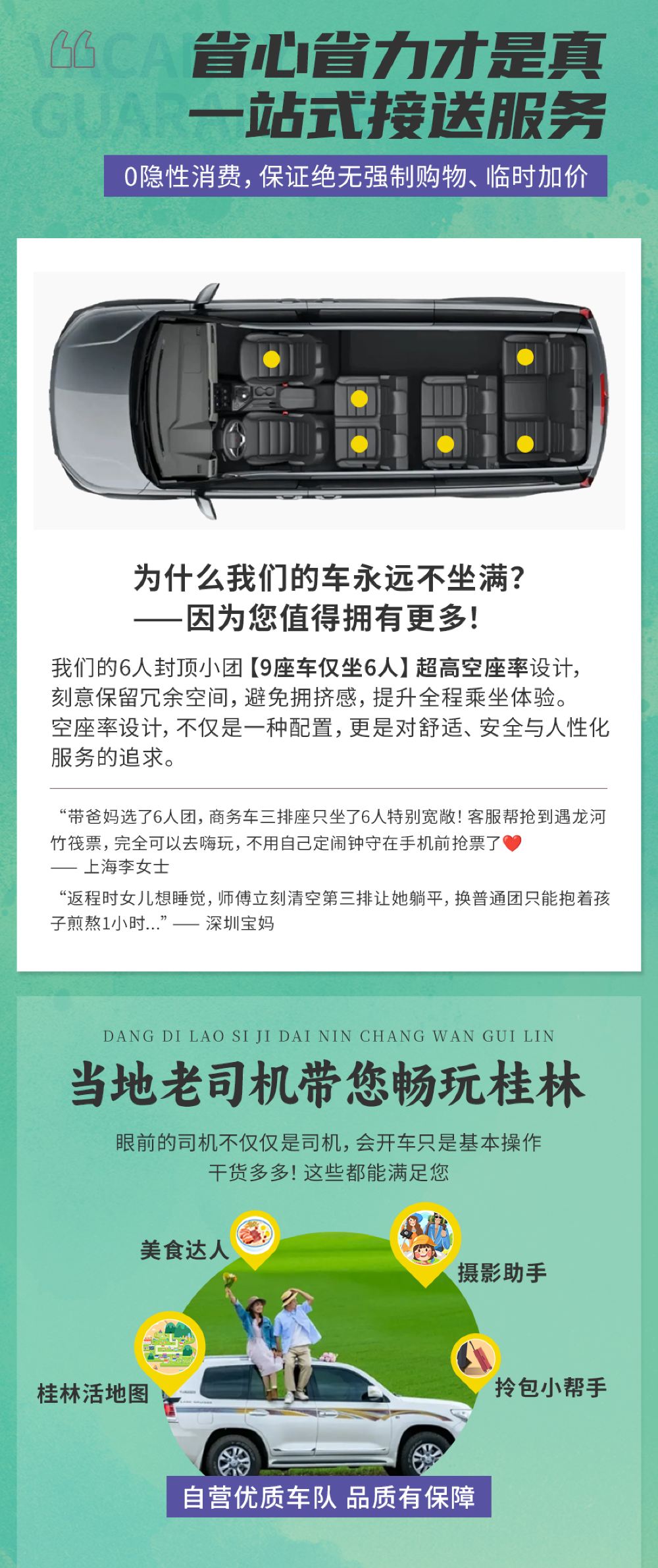 1、我们的2-6人精致小团,人少出行更自由,相当于8人的价格只坐6人,车内空间更大,乘车体验更舒适