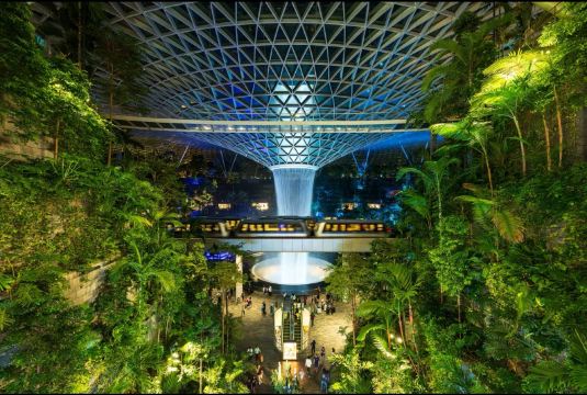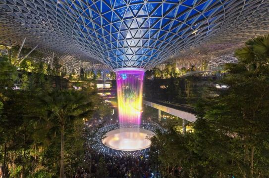 ▲ 星耀樟宜:集购物、餐饮与景观于一体的网红地标,核心亮点是40米高的雨漩涡瀑布,搭配环形天桥和灯光效果,随手拍出科幻感大片