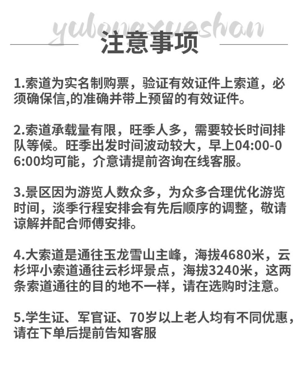 (3)旺季、节假日来临玉龙雪山小索道需提前4天才有票,临时都是抢票,抢票的成功率不定。万一抢不到全额退款互不违约请看好条款再下单。介意者勿拍,谢谢谅解