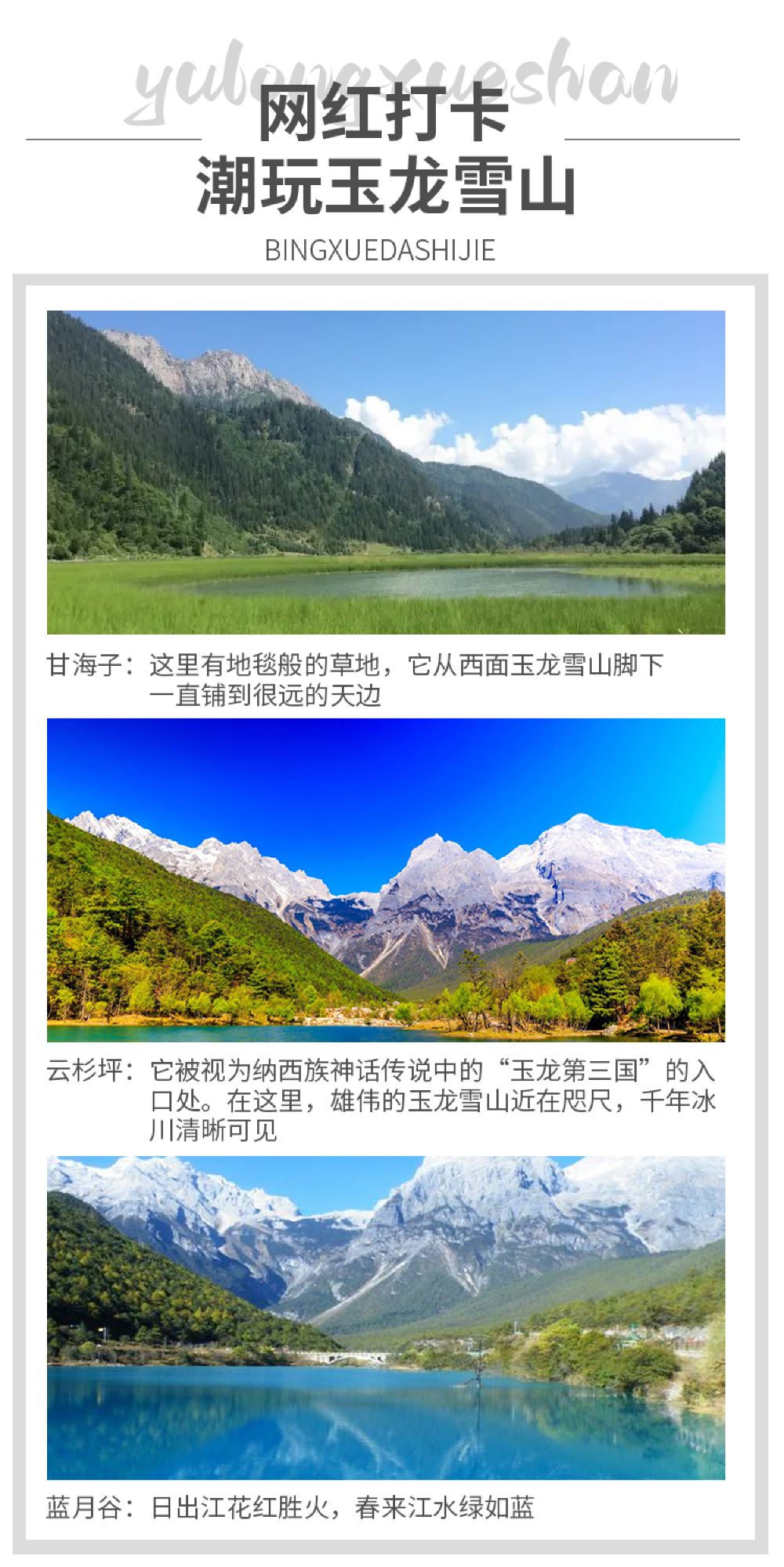丽江玉龙雪山云杉坪+蓝月谷一日游+14人内精致小团赠衣氧【此行程是乘坐小索道前往玉龙雪山景区的云杉坪景点游玩,并非去4680的冰川公园,请您看好后再下单】