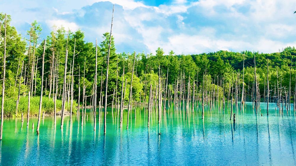 ▲ 【青池】:从美瑛的白金温泉驾车只需要5分钟的秘境。它的魅力之处也被苹果公司认可并且做成了壁纸。