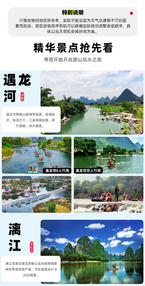 阳朔遇龙河竹筏漂游+漓江相公山千里江山图一日【小团|包团】【[便捷方式]真小团,真纯玩,小众出行性价比高。[包团]一单一团,时间景点可按需调整,本地玩家带你嗨】