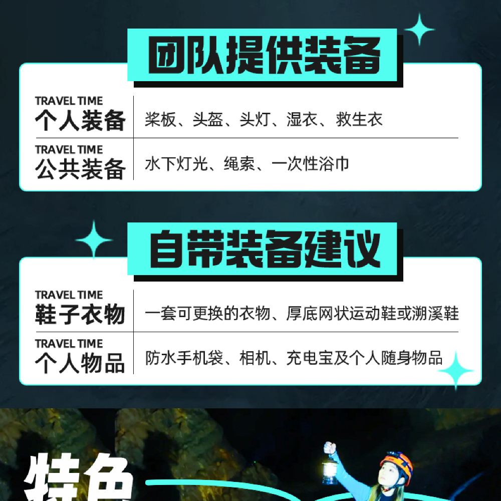 3、户外探洞活动不同于传统旅游,具有一定的危险性,要求参与者身体健康、无重大疾病史、非孕妇、无传染性疾病等,因此参加者须对自己的安全负责,对自身情况和活动要求做好充分评估,并充分告知客服自身身体状况,查看风险告知书,签署免责声明;如代他人报名请务必核实其情况;未成年人必须有监护人陪同方可参加活动,并有监护人对其负责。
